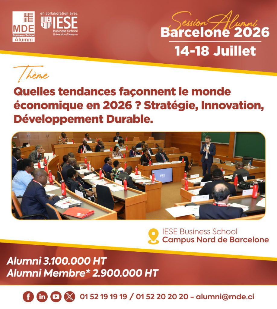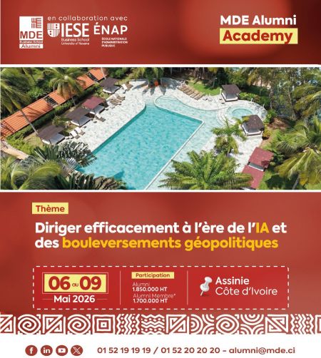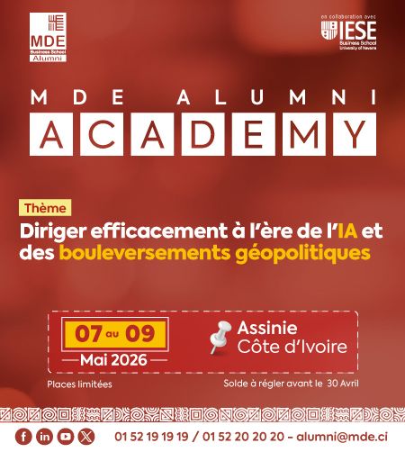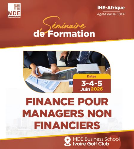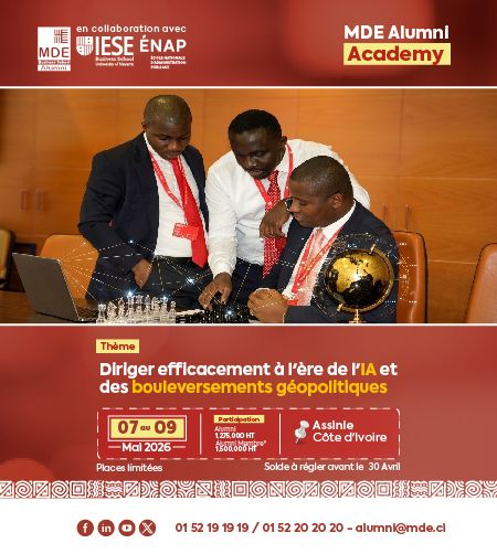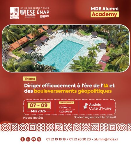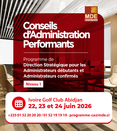 MDE (Management et Développement d’Entreprise) est une Business School qui a son siège à Abidjan et travaille à donner une formation de qualité aux dirigeants et cadres des organisations et à faire de la recherche dans le domaine du management et de l’activité économique dans toute l’Afrique Francophone, en commençant par la Côte d’Ivoire.